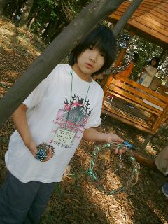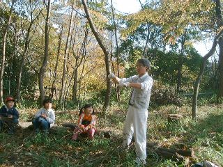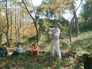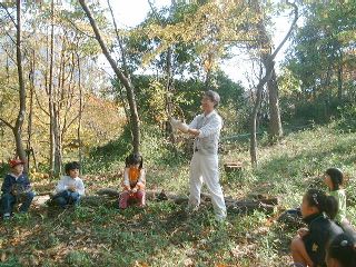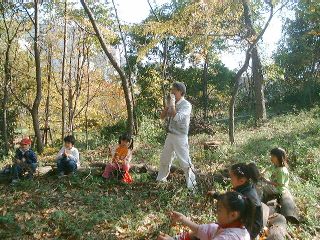 | 「みなさ〜ん、こっちを見てよく聞いていてくださいネ〜」立山教頭先生の声が静かな学校林にひびく。 | 「さぁ、このふつうのつるが・・・・」さぁ、教頭先生のマジックショーのはじまり〜。 |