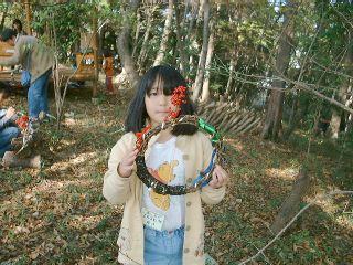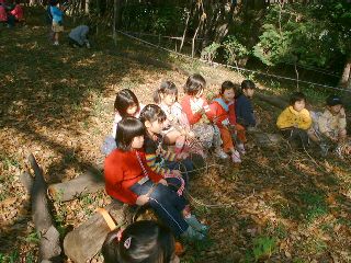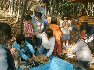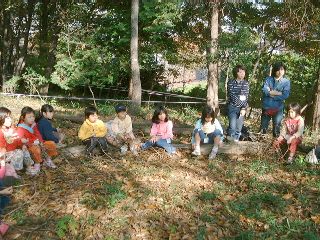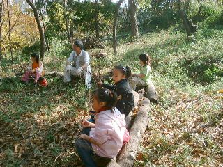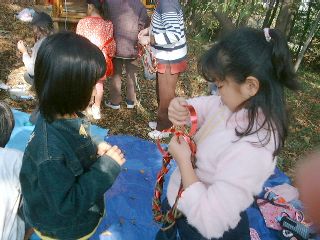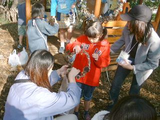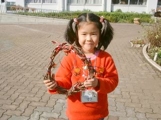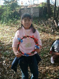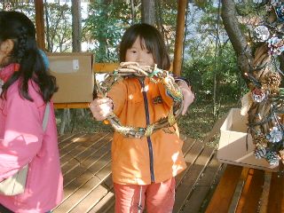 学校林の中のせまい広場では「学校林で遊ぼうU〜木の実のリース作り」が行われました。学校林にたくさんあるつるや木の実を集め、木立の中でクリスマス・リースを作るのです。教頭先生の手で、ただのつるがみるみるうちにきれいなリースに変身していくのは驚きでした。