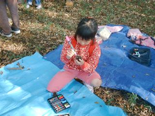 | いっしょうけんめい、松ぼっくりに色つけ中・・・ | 「私がリボンをつけてあげる」 |