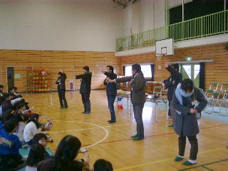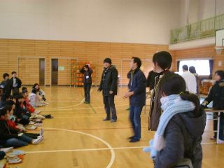 | スタッフの山本さんからの突然の要請にもちゅうちょなくゲームを始める児童文化研のお兄さん・お姉さん。さすがですね〜。 | ここでも子供たちに「おじさん」と呼ばれてショックを受けている吉崎さん |
