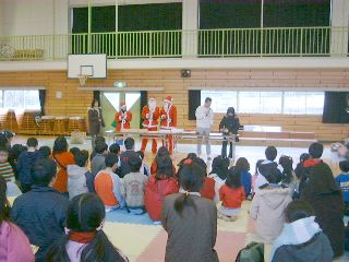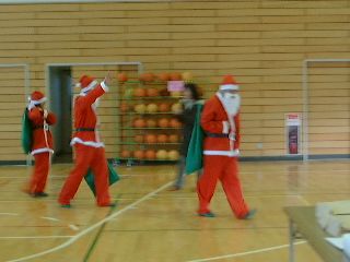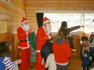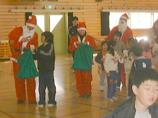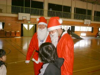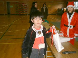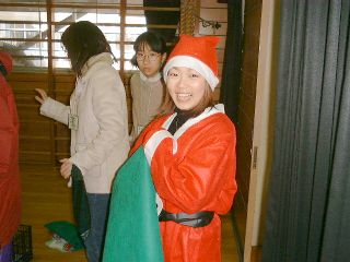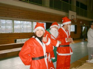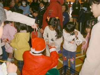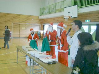 | 「ボクにも下さい」ビンゴ大会が無事終わって、残念ながら外れた子供たちにも、お菓子を配るサンタさん。 | 笑顔のサンタお姉さん。似合ってますよ! |