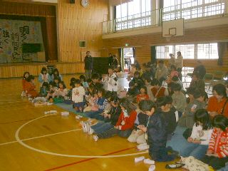 | みんな真剣な目つきでビンゴカードを見つめている。(勉強もこのぐらい真剣になってくれたらいいのになぁ・・・2人の娘の親としての感想) | 「やった!リーチ!」「え〜!いいな〜」ざわつく会場 |