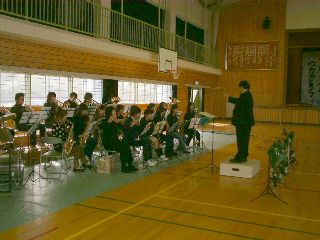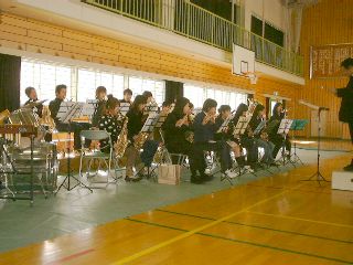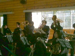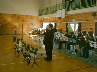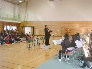 体育館では11:00からクリスマスコンサートが開催されました。サッカーや人形劇などの他の会場からみんなが集まってきて、楽しいクリスマスコンサートの始まりです。今日は八王子青少年ウィンド・オーケストラのお兄さん・お姉さん方(お一人だけおじさんが混じっていますが)がいろいろな楽器を演奏して下さいました。