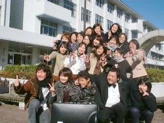 | 終わった後、中庭で記念(?)撮影、「いぇ〜い!」 | 「もう一度いい顔で!に〜〜〜!」 |