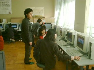 | 「ほうら、こうすればできるでしょ?」「あっ、ほんとだ」やさしく教えてくれるイーフロンティアの石田さん | 「ここをxxしたいの」「えっ、ちょっとそれはむずかしいなぁ」「でもどうしてもやってみたい!」「しかたないなぁ、ちょっとためしてみようか」女の子からのお願いにはやはり弱い?杉野さん |