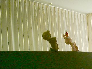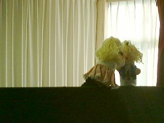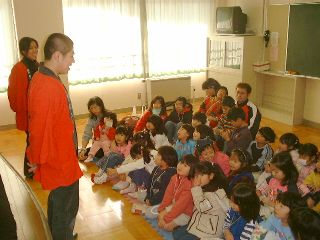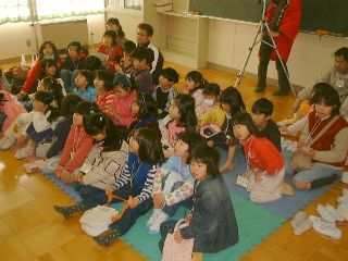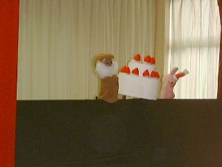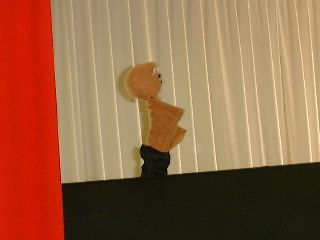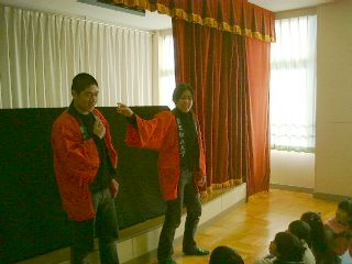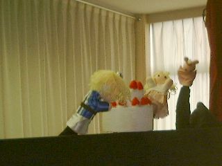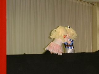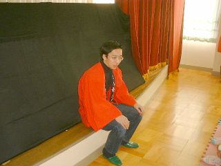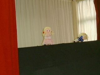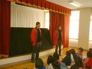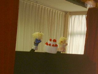 | 「さぁ、この人はだれでしょう?」「変なおじさん!」「実はこの人はダンディっていうんだよ」「ハハハハ!変」(自称ダンディ氏:うっ、最近の子供はきつい・・・) | 「ボクは何をするか知っている?」「わかんな〜い!」「ボクは人形劇をやるんだよ。」「うっそ〜!にあってないよ〜」(ダンディ少々おされ気味) |