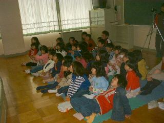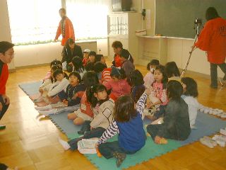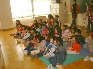 | 受付開始「何年生?」「1年生」「え〜、大きいねぇ。もっと上かと思った」 | まだ観客が集まりかけの頃「ねぇ、何もって来たの?」「お母さんに買ってもらったバッグだよ」「へぇ〜、こんなかわいいのがあるんだねぇ・・・」 |