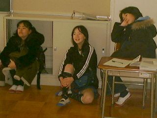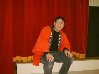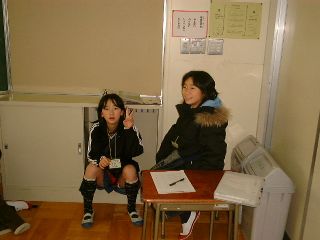 | なんと床の上にきちんと座って見ている。床の上に直接座って冷たくないのかな? | 受付も一段落、「今日の人形劇は面白いね」「おっと、ぴーす!」(こいつ、しっかりカメラを意識しているな・・・某カメラマン) |