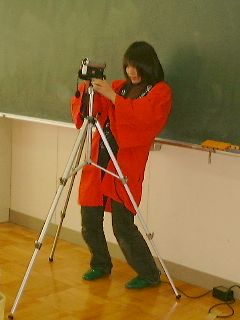 | 児童文化研の1回生です。いい笑顔ですね〜。 | 「このぐらいの角度でいいかな?・・・うわぁ!〜・・・もうっ、急にカメラの前に大きな顔を出されるとのけぞっちゃうよ〜」 |