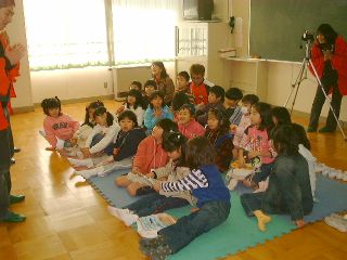 | 「いっぱいになってきちゃったね。もう少しつめてお友達をすわらせて欲しいな〜。」「は〜い」みんな意外とすなお。 | 「今日の人形劇はどんなタイトルか知ってるかい?」「知ってる〜、『楽しいクリスマス』だよ!」「えっ!?、よ、よく知っているね〜」「だってここ(サタデー新聞)に書いてあるもの」「あ、なるほど(汗)」(いまだにダンディ押され気味) |