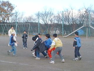 | 激しいボールの奪い合い。「う〜、だれだ押すのは〜!」 | 「ここは大人の意地を見せなきゃ・・・」必死になってボールをキープ。 |