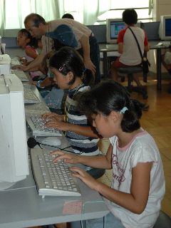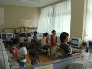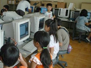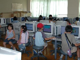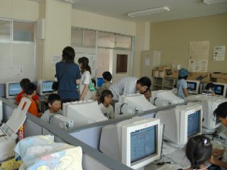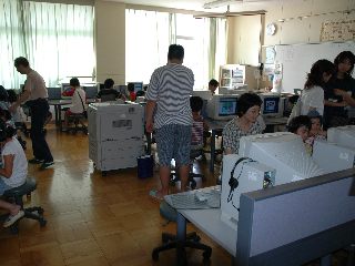 パソコン室では、子どもたちがインターネットやお絵かきに夢中。お父さん、お母さん方も、子どもに「どうしたらいいの?」と質問されて必死です。