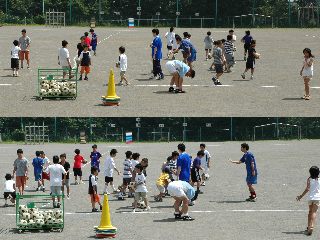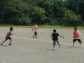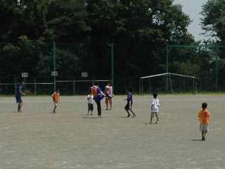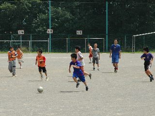 | 子どもが攻めて大人が守る・・・さあ、勝つのはどっちだ?ボールの正面がスタッフの星さん、その向こうが及川さん。 | 「は〜、暑かったな・・・・」どちらもがんばったね。 |